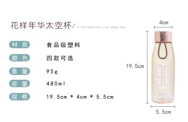 產(chǎn)品特點(diǎn):食品級(jí)塑料,多種顏色選擇,480ML容量,便攜式提繩,手感舒適,細(xì)膩