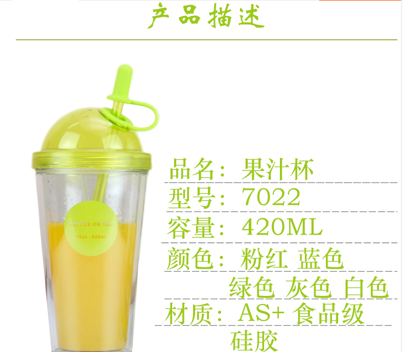 產(chǎn)品特點:AS食品級材質(zhì),420M容量,多種顏色選擇,雙層果汁杯、牛奶杯